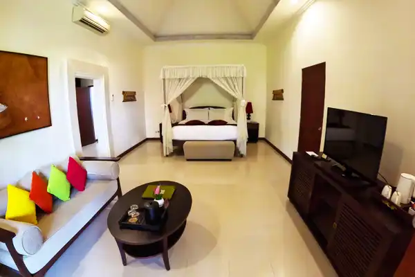 For a cozy and intimate experience, the Deluxe Rooms are perfect. These feature elegant furnishings, spacious interiors, and private balconies or terraces that overlook the lush gardens or tranquil pool. These Deluxe Rooms are ideal for couples or solo travelers seeking a peaceful retreat with all the comforts of home.